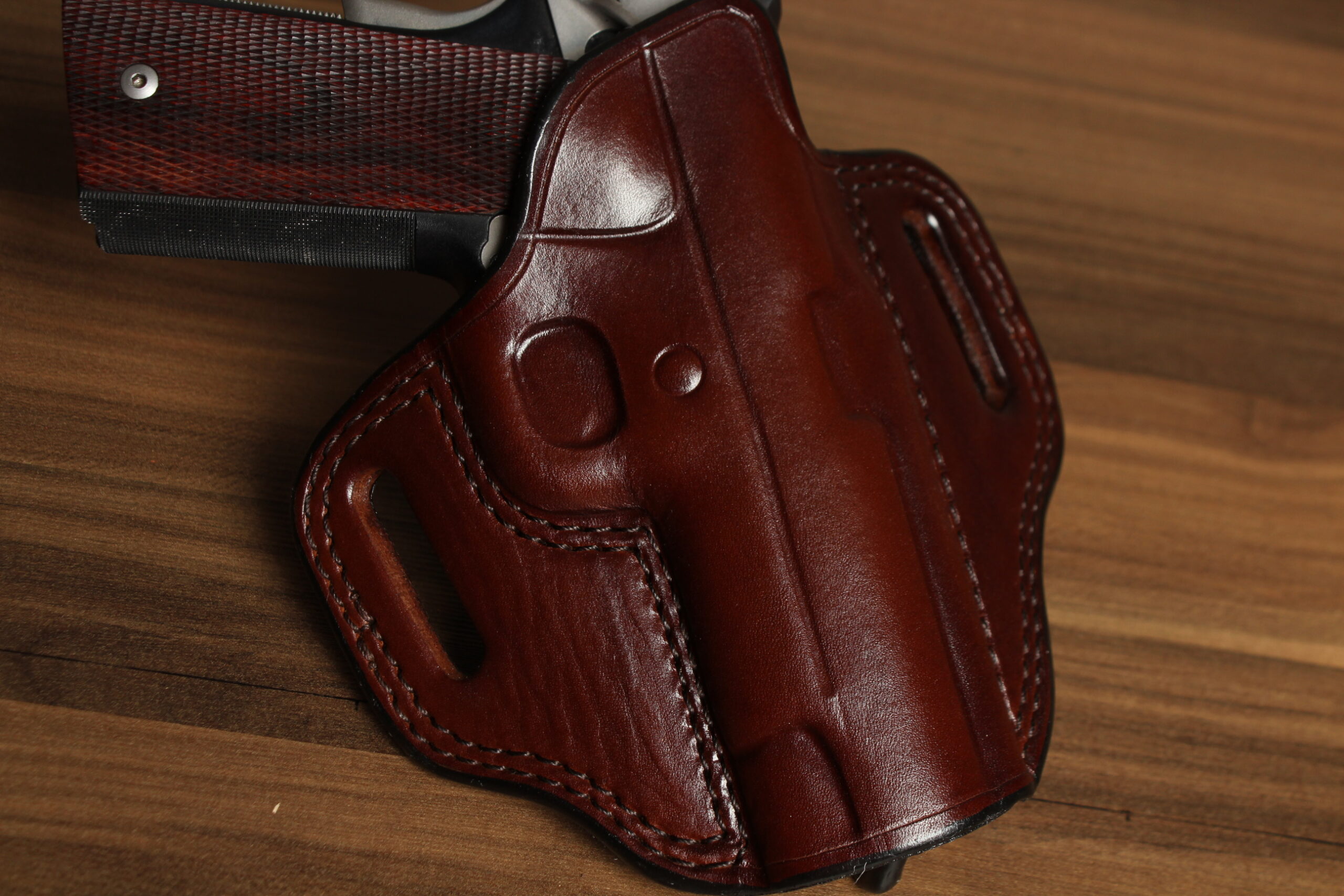 We start by cutting from the best part of the hide. We then hand dye the holster to ensure a rich deep color that will accent your firearm. All our holsters are sewn using seven cord bonded nylon thread and double stitched in all critical areas. Each holster is then hand molded for a perfect fit and contoured to the hip for comfort. The edges are then sanded and hand burnished to a smooth glossy finish. This helps prevent moisture from entering the edges of the leather. They are then polished and finished with a clear coating to protect the finish. Our concealed carry designs secure your firearm while still providing instant access when needed. Our holsters are built to last a lifetime.