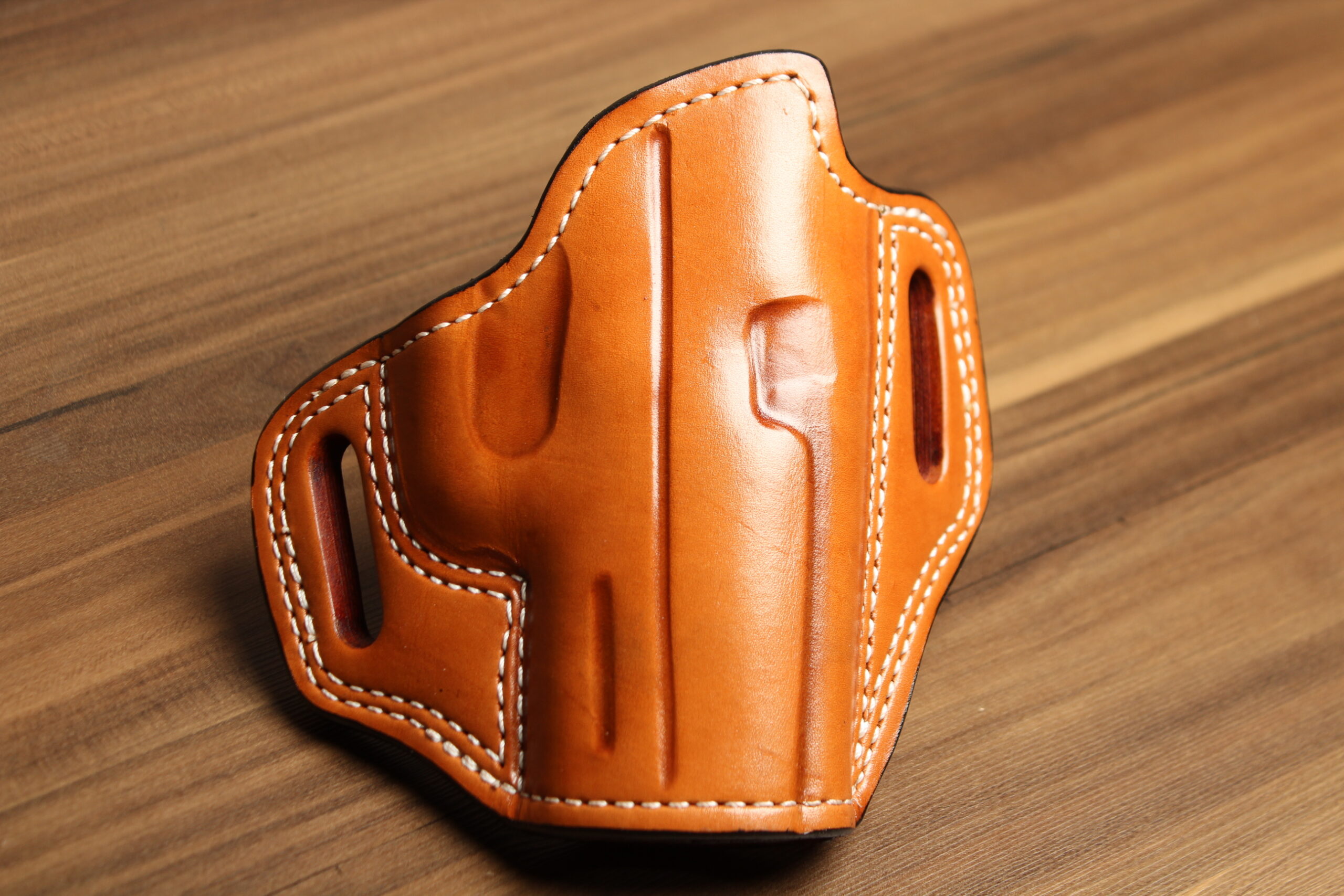 We start by cutting from the best part of the hide. We then hand dye the holster to ensure a rich deep color that will accent your firearm. All our holsters are sewn using seven cord bonded nylon thread and double stitched in all critical areas. Each holster is then hand molded for a perfect fit and contoured to the hip for comfort. The edges are then sanded and hand burnished to a smooth glossy finish. This helps prevent moisture from entering the edges of the leather. They are then polished and finished with a clear coating to protect the finish. Our concealed carry designs secure your firearm while still providing instant access when needed. Our holsters are built to last a lifetime.
