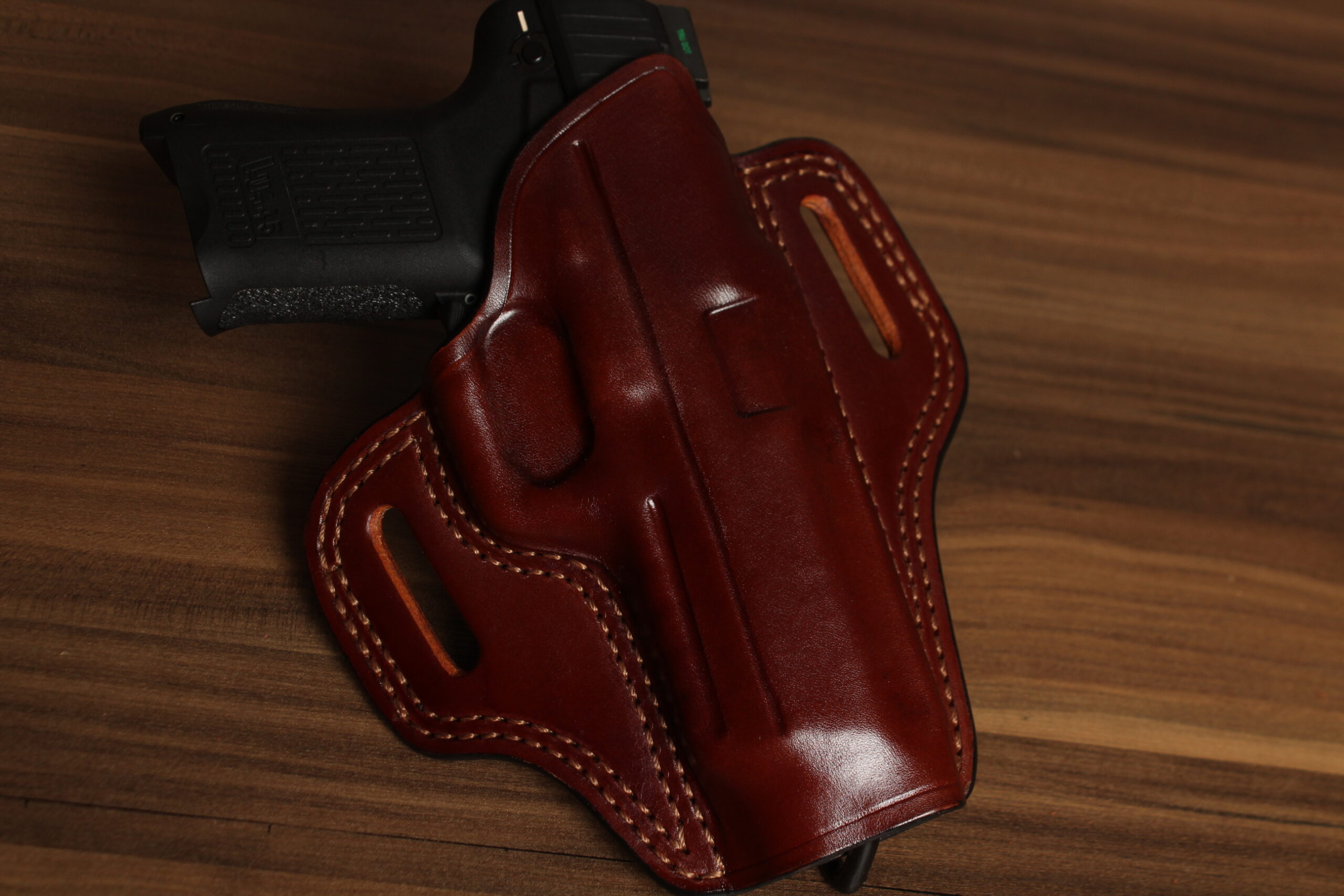 We start by cutting from the best part of the hide. We then hand dye the holster to ensure a rich deep color that will accent your firearm. All our holsters are sewn using seven cord bonded nylon thread and double stitched in all critical areas. Each holster is then hand molded for a perfect fit and contoured to the hip for comfort. The edges are then sanded and hand burnished to a smooth glossy finish. This helps prevent moisture from entering the edges of the leather. They are then polished and finished with a clear coating to protect the finish. Our concealed carry designs secure your firearm while still providing instant access when needed. Our holsters are built to last a lifetime.
