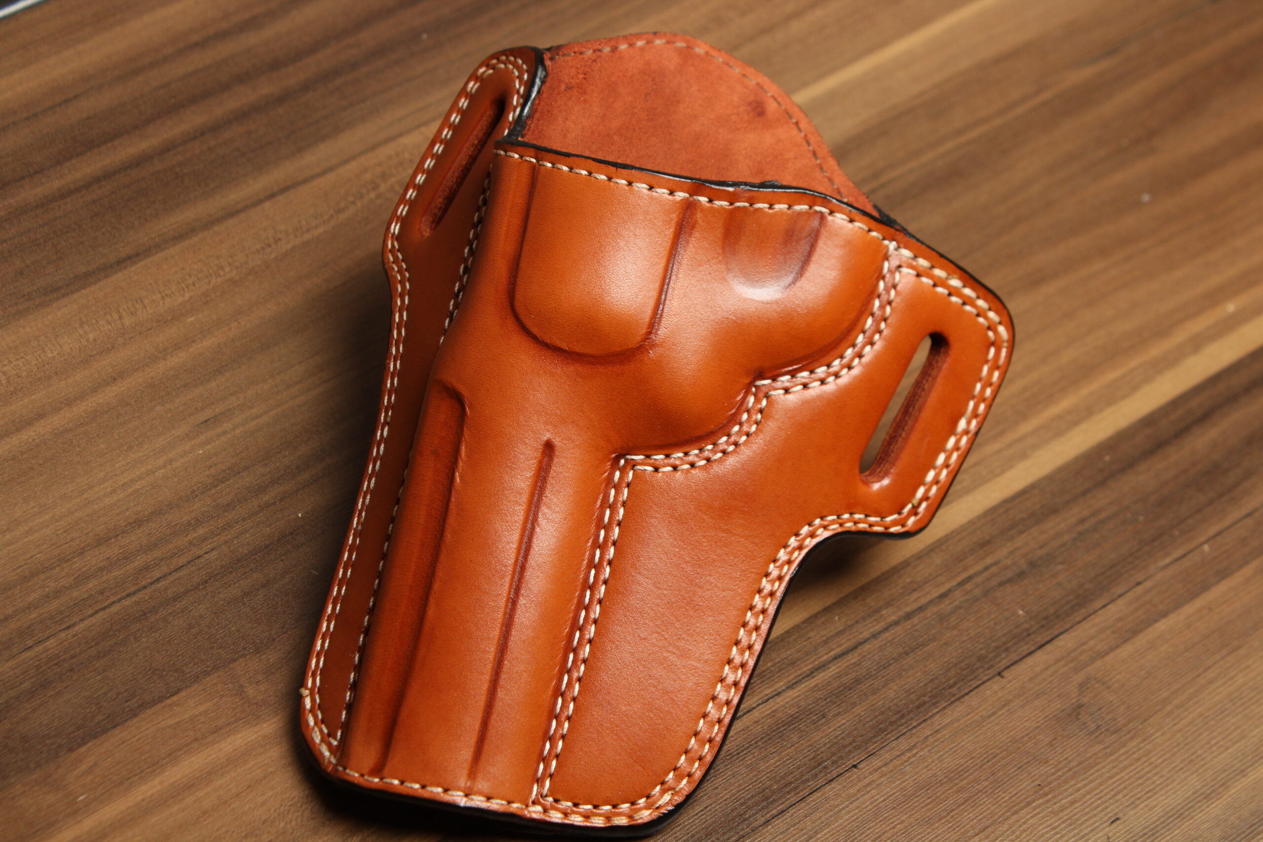 The Model 2020 OWB revolver leather holster was born out of a request from a local judge here in Laredo. He wanted a revolver holster for his Kimber K6s, one that would fit on his belt loop but stay close to the body for effective concealment.