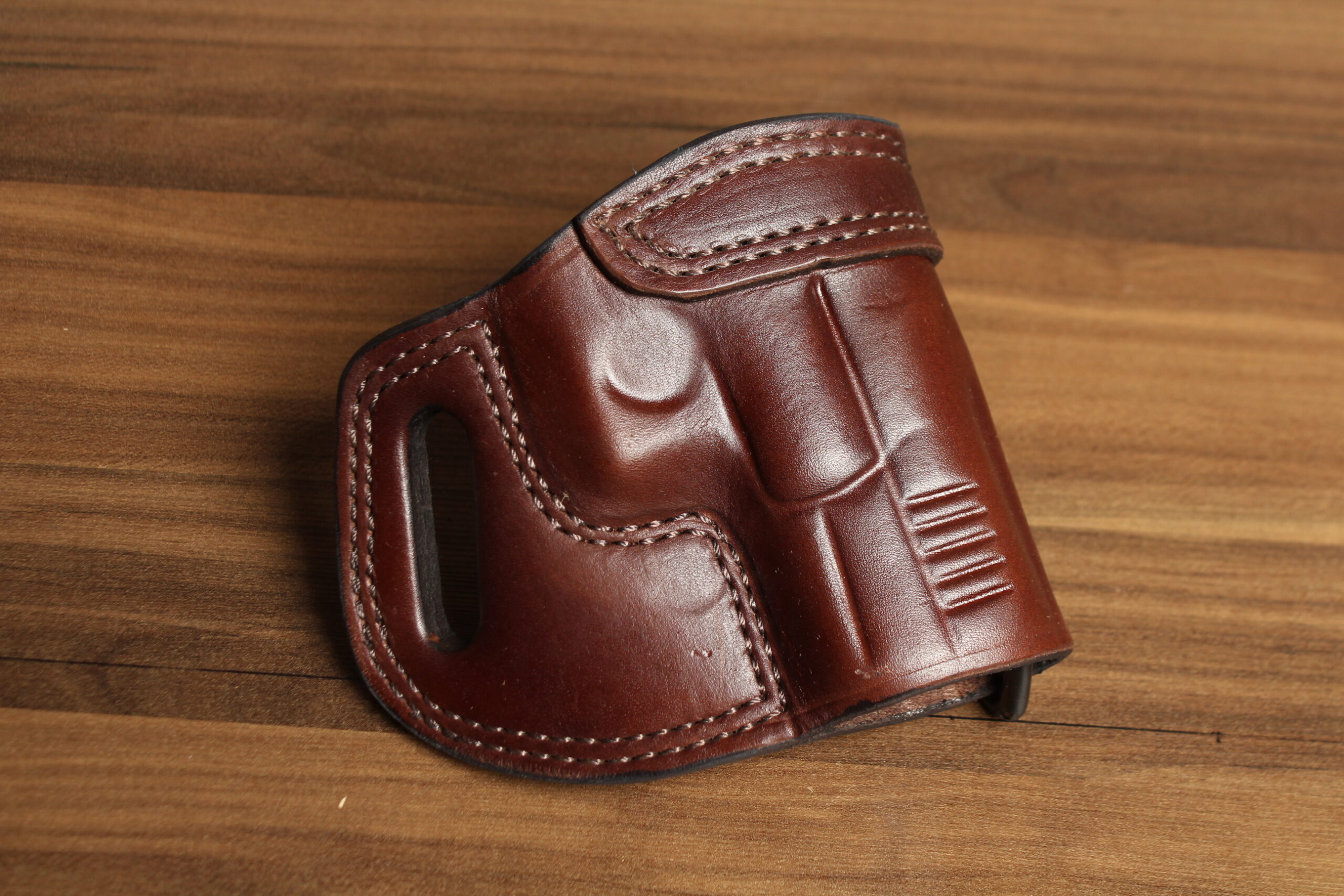 We start by cutting from the best part of the hide. We then hand dye the holster to ensure a rich deep color that will accent your firearm. All our holsters are sewn using seven cord bonded nylon thread and double stitched in all critical areas. Each holster is then hand molded for a perfect fit and contoured to the hip for comfort. The edges are then sanded and hand burnished to a smooth glossy finish. This helps prevent moisture from entering the edges of the leather. They are then polished and finished with a clear coating to protect the finish. Our concealed carry designs secure your firearm while still providing instant access when needed. Our holsters are built to last a lifetime.