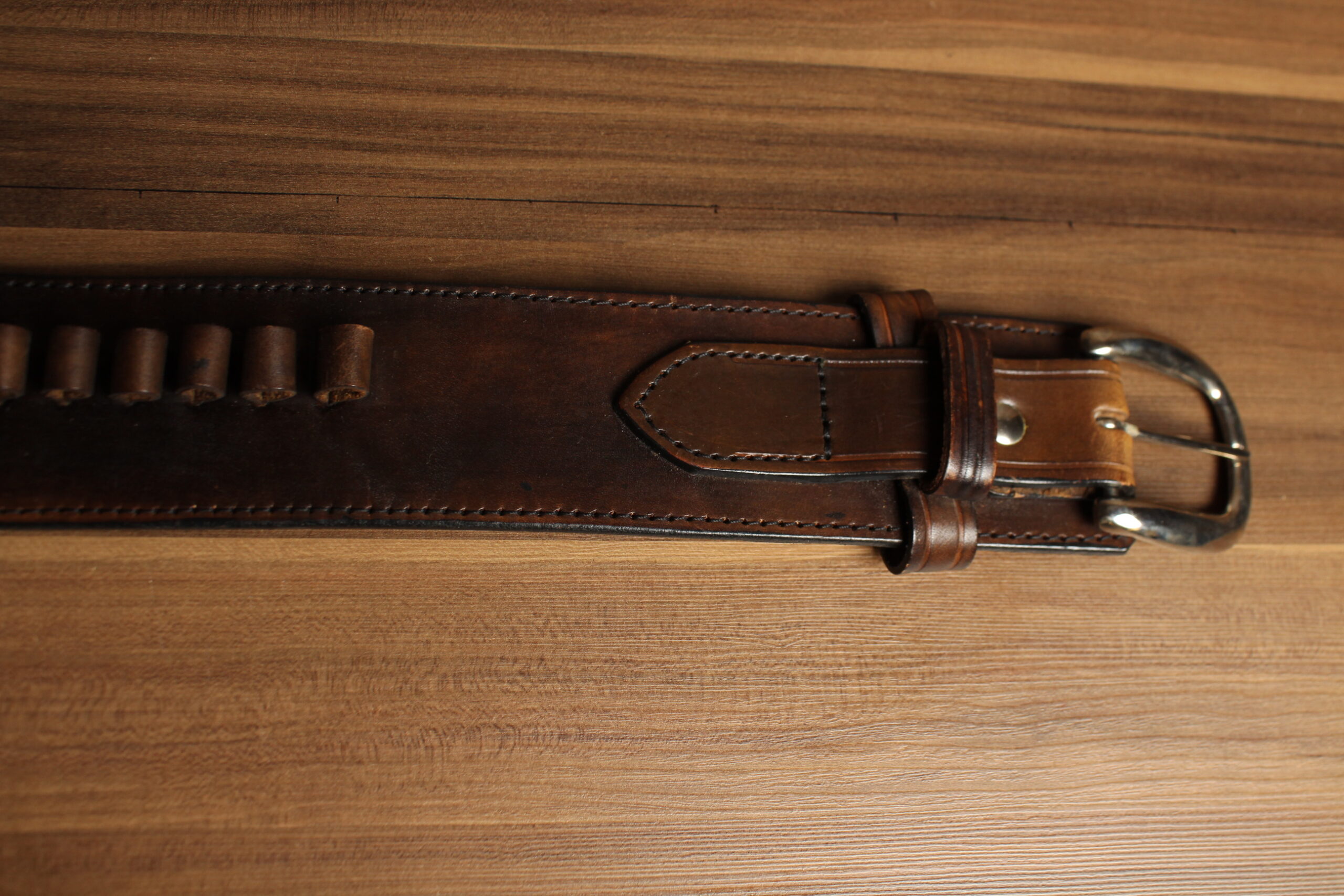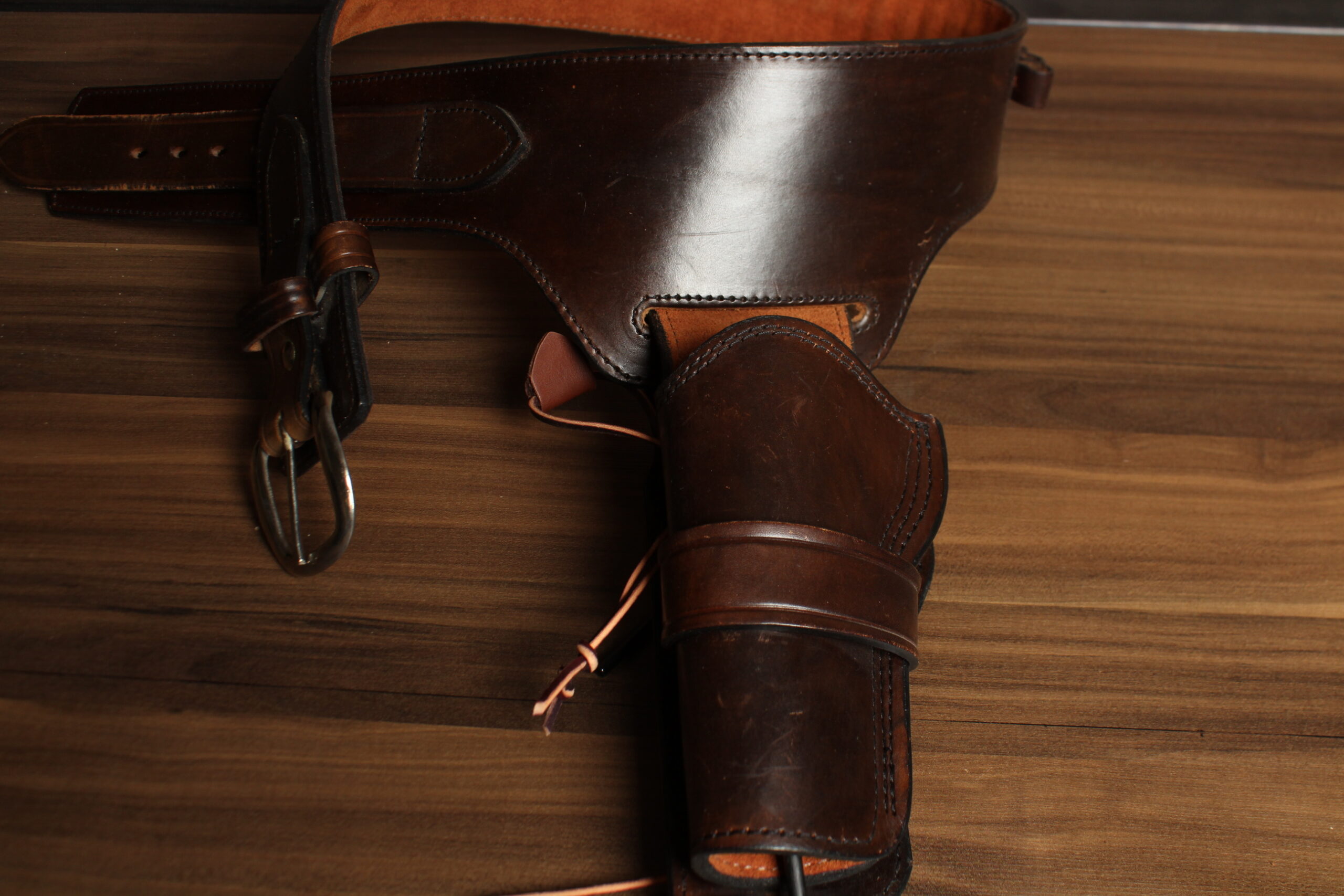 We start by cutting from the best part of the hide. We then hand dye the holster to ensure a rich deep color that will accent your firearm. All our holsters are sewn using seven cord bonded nylon thread and double stitched in all critical areas. The heavy weight construction also makes sure the holsters stay open when re-holstering. Each holster is then hand molded for a perfect fit. The edges are then sanded and hand burnished to a smooth glossy finish. This helps prevent moisture from entering the edges of the leather. They are then polished and finished with a clear coating to protect the finish. The belts are made using heavy 9 oz. saddle leather and are fully leather lined. They feature 24 hand molded bullet loops and come equipped with high quality solid steel and brass hardware. Our custom gun belts are built to last a lifetime.