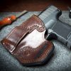 We start by cutting from the best part of the hide. We then hand dye the holster to ensure a rich deep color that will accent your firearm. All our holsters are sewn using seven cord bonded nylon thread and double stitched in all critical areas. Each holster is then hand molded for a perfect fit and contoured to the hip for comfort. The edges are then sanded and hand burnished to a smooth glossy finish. This helps prevent moisture from entering the edges of the leather. They are then polished and finished with a clear coating to protect the finish. Our concealed carry designs secure your firearm while still providing instant access when needed. Our holsters are built to last a lifetime.